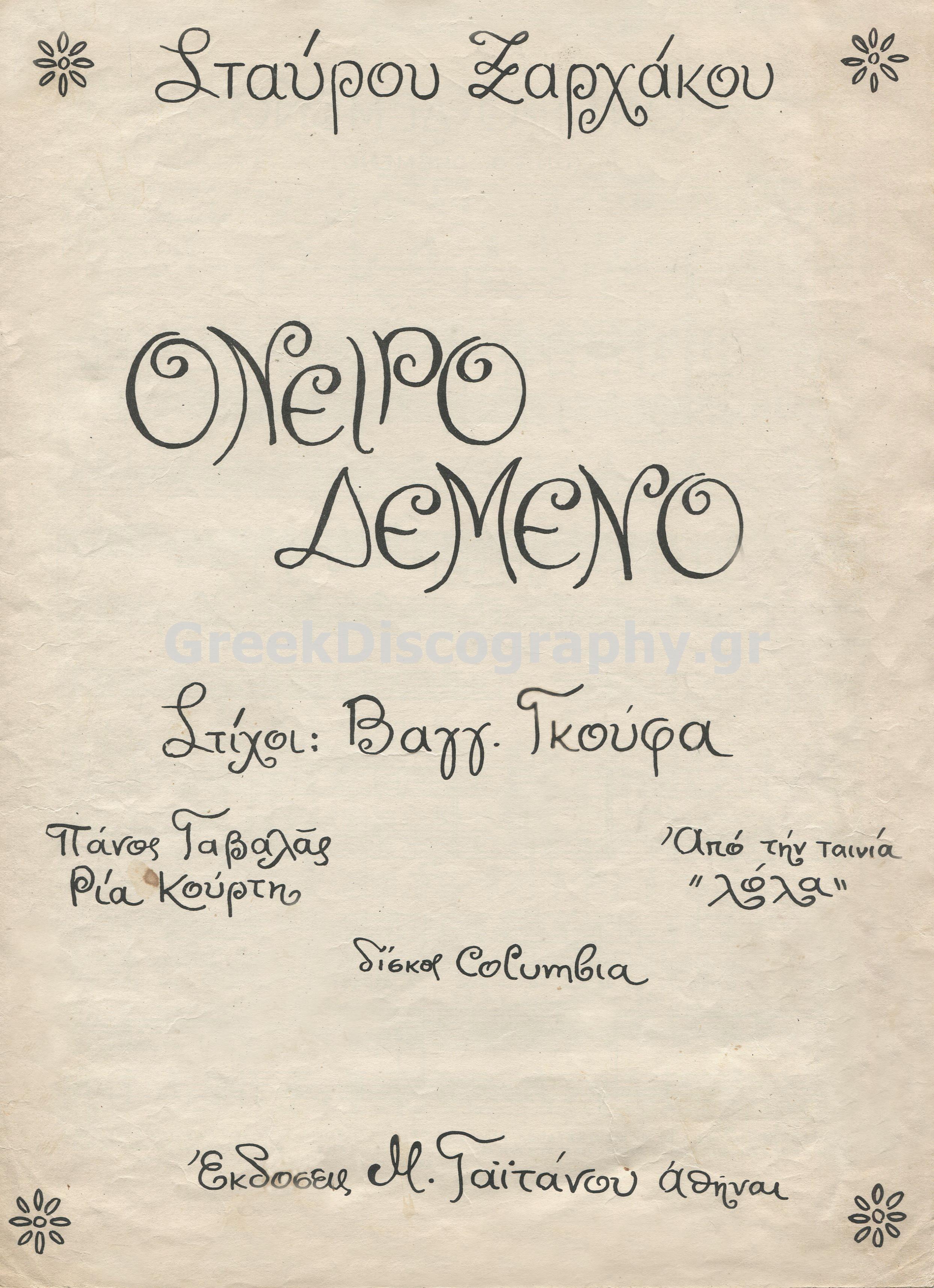 Κιθάρα: ΜΗΛΙΑΡΕΣΗΣ ΓΕΡΑΣΙΜΟΣ, Κιθάρα: ΦΑΜΠΑΣ ΔΗΜΗΤΡΗΣ, Κόρνο: ΚΑΝΤΣΗΣ ΓΕΡΑΣΙΜΟΣ, Μαντολίνο: ΒΡΑΣΚΟΣ ΔΗΜΗΤΡΗΣ, Μαντολίνο: ΓΑΒΡΙΗΛΙΔΗΣ ΜΙΧΑΛΗΣ, Μαντολίνο: ΤΣΙΜΟΠΟΥΛΟΣ ΑΓΓΕΛΟΣ, Μεταλόφωνο: ΔΙΑΚΟΓΙΩΡΓΗΣ ΤΑΣΟΣ, Μπάσο: ΣΕΪΤΑΝΙΔΗΣ ΚΩΣΤΑΣ, Μπουζούκι: ΖΑΜΠΕΤΑΣ ΓΙΩΡΓΟΣ, Μπουζούκι: ΖΑΜΠΕΤΑΣ ΜΙΧΑΛΗΣ (Ι), Μπουζούκι: ΚΑΡΑΜΠΕΣΙΝΗΣ ΓΙΑΝΝΗΣ, Ντράμς: ΜΙΧΑΗΛ ΚΩΣΤΑΣ, Τσέλο: ΤΑΧΙΑΤΗΣ ΣΩΤΗΡΗΣ